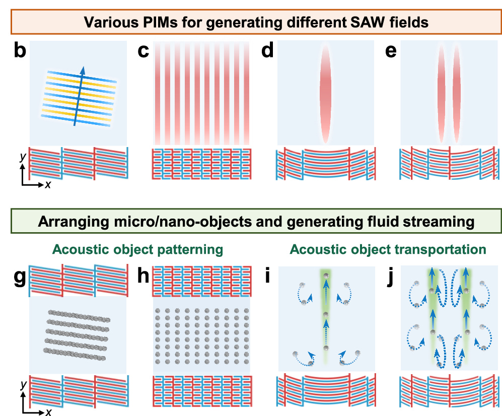 In this case, the researchers found that if you arrange these electrodes in special patterns they can create acoustics allowing specific manipulation of particles and fluids on the chip itself through the forces resulting from the acoustic waves. These patterns and their acoustic “force” fields look like this: